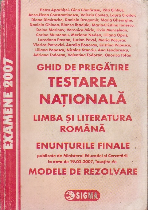 Variantele de subiecte publicate de Ministerul Educatiei si Cercetarii la data de 19.02.2007. Neavand pretentia ca modul de rezolvare al variantelor de subiecte propuse de M.Ed.C. este unic, lucrarea se doreste a fi de un real folos elevilor din clasa a VIII-a. Colectivul de autori care a realizat aceste rezolvari a oferit atat raspunsuri complete (pentru partea de Limba romana), cat si schite de abordare a subiectelor de Literatura romana.