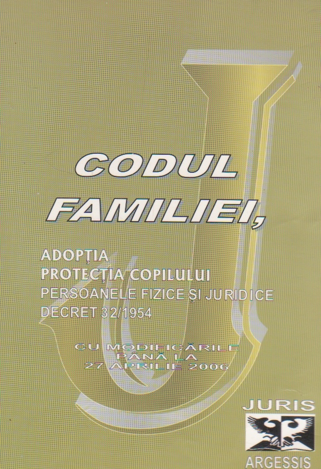 Comandă online Codul familiei. Adoptia. Protectia copilului - persoanele fizice si juridice (Decret 32/1954) cu modificarile pana la 27 aprilie 2006 la 10,60 lei, tiparită la editura Juris Argessis în anul 2006 cu un număr de 190 pagini categorie Dreptul familiei, Drept. cu plata ramburs sau online cu cardul. Momentan titlul Codul familiei. Adoptia. Protectia copilului - persoanele fizice si juridice (Decret 32/1954) cu modificarile pana la 27 aprilie 2006 nu este disponibil însa vă puteți înscrie pentru a fi notificat în momenul reaprovizionarii.