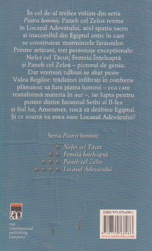 In ce de-al treilea volum din seria piatra luminii, Paneb cel Zelos revine in Locasul Adevarului, acel spatiu sacru si inacesibil din Egiptul antic in care se construiesc mormintele faraonilor. Printre artizani, trei personaje exceptionale: Nefer cel tacut, Femeia Inteleapta si Paneb cel Zelos - pictorul de geniu.Dar vremuri tulburi se abat peste valea Regilor: tradatori infiltrati in interiorul confreriei planuiesc sa fure piatra de lumina-cea care transforma materia in aur - , iar lupta pentru putere dintre faraonul Sethi al II -lea si fiul lui Amenmes risca sa dezbine Egiptul. Si ce soarta va avea oare Locasul Adevarului?