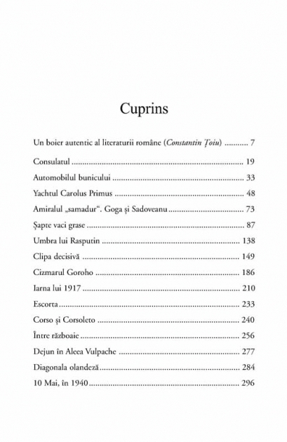 Sub patru regi, intre La Belle Epoque si 23 august 1944, defileaza o galerie eclectica de personalitati – Ionel Bratianu, N.D. Cocea, Pamfil Seicaru, Duiliu Zamfirescu, Sadoveanu, Mateiu Caragiale, Vinea, Paul Morand, Maresalul Antonescu, Zelea-Codreanu, Mita Biciclista, Elena Lupescu, Enescu, Pastorel, Stere, Cezar Petrescu… Lux, supeuri, baluri, separeuri, coupé-uri, Rolls-uri, matasuri, briliante, blanuri, tango, Veuve Clicquot, icre negre, poker, chemin-de-fer, Capsa, Corso, Athénée Palace, Europolis, Bucuresti, Iasi… Conspiratii, razboi, bombardamente, refugiu, paduchi, plosnite, singe, noroi… Bolsevici, garzi patriotice, Roossevelt, Stalin, Churchill…
