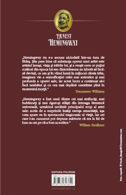 Traducere din limba engleza si note de Ionut Chiva Ernest Hemingway este laureat al Premiului Pulitzer (1953) si al Premiului Nobel pentru Literatura (1954). „Hemingway nu s-a ascuns niciodata intr-un turn de fildes. Stia prea bine ca substanta operei unui artist este artistul insusi, viata si trairile lui, si a reusit ceea ce putini scriitori din epoca lui sau dintotdeauna au izbutit sa faca: sa devina, ca om si in vazul lumii in mijlocul careia traia, imaginea vie a semnificatiei celei mai autentice si mai profunde a operei sale, iar acest lucru a continuat sa-l faca neabatut si cu cea mai deplina onestitate pina in momentul mortii.” (Tennessee Williams) „Hemingway a fost unul dintre cei mai straluciti, mai indrazneti si mai rigurosi stilisti din intreaga literatura universala, urmarind neclintit principalul scop al artei sale: acela de a surprinde insasi esenta umanitatii, asa cum apare ea in spectacolul tragicomic al vietii. Iar cei care l-au cunoscut pot depune marturie ca era la fel de bun ca om pe cit a fost ca scriitor.” (William Faulkner)