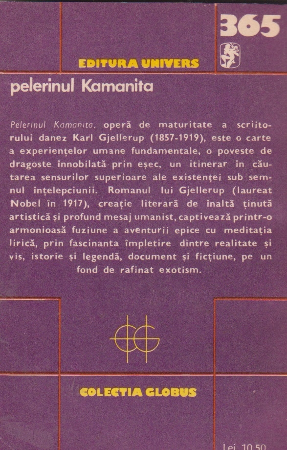 Pelerinul Kamanita,opera de maturitate a scriitorului danez Karl Gjellerup este o carte a experientelor umane fundamentale, o poveste de dragoste innobilata prin esec, un itinerar in cautarea sensurilor superioare ale existentei sub semnul intelepciunii. Romanul captiveaza printr-o armonioasa fuziune a aventurii epice cu meditatia lirica, prin fascinanta impletire dintre realitate si vis, istorie si legenda, document si fictiune, pe un fond de rafinat exotism.