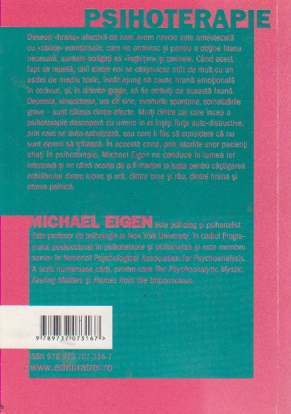 Deseori «hrana» afectivă de care avem nevoie este amestecată cu «toxine» emoţionale, care ne otrăvesc şi pentru a obţine hrana necesară, suntem obligaţi să «înghiţim» şi toxinele. Când acest fapt se repetă, unii dintre noi se obişnuiesc atât de mult cu un astfel de mediu toxic, încât ajung să caute hrană emoţională în otrăvuri, şi, în diferite grade, să fie otrăviţi de această hrană. Depresia, sinuciderea, ura de sine, avorturile spontane, somatizările grave – sunt câteva dintre efecte. Mulţi dintre cei care încep o psihoterapie descoperă cu uimire în ei înşişi forţe auto-distructive, prin care se auto-sabotează, sau care îi fac să considere că nu sunt demni să trăiască. în această carte, prin istoriile unor pacienţi aflaţi în psihoterapie, Michael Eigen ne conduce în lumea lor interioară şi ne oferă ocazia de a fi martori la lupta pentru câştigarea echilibrului dintre iubire şi ură, dintre bine şi rău, dintre hrana şi otrava psihică.