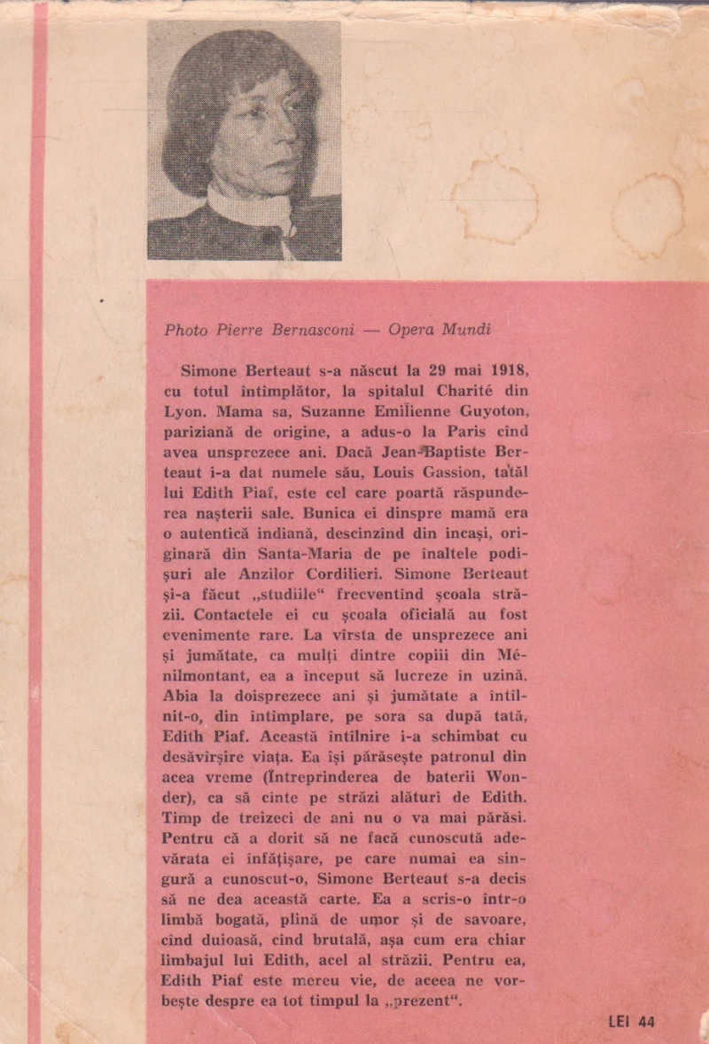 Comandă online cartea "Edith Piaf - Povestire" la 26,40 lei Piaf scrisă de Simone Berteaut Constanta Nicolescu, tiparită la editura Muzicala. cu plata ramburs sau online cu cardul. Momentan titlul "Edith Piaf - Povestire" nu este disponibil însa vă puteți înscrie pentru a fi notificat în momenul reaprovizionarii.