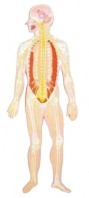 Reprezentare schematică a sistemului osos şi nervos (central şi periferic) micşorat la jumătate în basorelief.