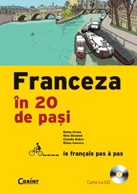 Limba franceza in 20 de pasi propune o metoda rapida si moderna de invatare a limbii franceze, destinata unui public larg: adolescenti, tineri sau adulti cu un nivel minim de competenta lingvistica, care doresc sa invete limba franceza sau care vor sa-si aprofundeze cunostintele gramaticale sau lexicale si sa-si dezvolte competentele de comunicare in limba franceza. Continuturile sunt structurate in douazeci de unitati, care abordeaza o tematica diversa: familie, relatii sociale, sanatate, profesii, cumparaturi, pasiuni, mijloace de comunicare, transport, corespondenta etc. Cele patru module recapitulative permit refolosirea, revizuirea si sistematizarea cunostintelor achizitionate pe parcursul a cate cinci lectii. Cursul este completat de o serie de anexe, care cuprind: un tabel de conjugare a verbelor neregulate, cheia exercitiilor, traducerea textelor-suport, precum si un vocabular francez-roman. Cartea este insotita de un CD audio cu secventele introductive ale fiecarei unitati, in lectura unor vorbitori nativi.