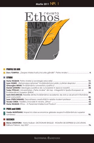 Anul acesta se implinesc 21 de ani de la infiintarea "Societatii Culturale ETHOS" si a "Fundatiei Academice Petre Andrei", din care s-a nascut Universitatea "Petre Andrei". Am reinfiintat dupa noua legislatie Societatea Culturala ETHOS si vom publica primul numar cu titlul ETHOS – THE NEW VIEW, pentru a marca aceasta a treia serie si modernizarea prezentarii revistei. Dorim sa abordam in continuarea traditiei probleme de filozofia culturii, psihologie, sociologie, analiza politica, in numere tematice ce vor acoperi treptat toate aceste domenii. Consideram ca astazi, in conditiile existentei unui numar de bune reviste specializate pe un anumit domeniu, tratarea problemelor de filosofia culturii este deficitara si putem sa ne aducem contributia in acest domeniu.