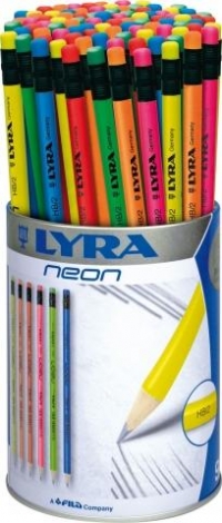 Creion Neon HB/2 cu guma, corp din lemn de diferite culori fluorescente: roz, galben, verde, portocaliu, albastru, rosu, ambalaj 96 buc/borcan