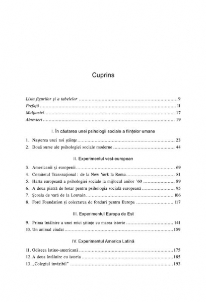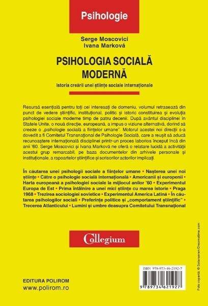 Resursa esentiala pentru toti cei interesati de domeniu, volumul retraseaza din punct de vedere stiintific, institutional, politic si istoric constituirea si evolutia psihologiei sociale moderne timp de patru decenii. Dupa avintul disciplinei in Statele Unite, o noua directie, europeana, a impus o viziune alternativa, dorind sa creeze o „psihologie sociala a fiintelor umane”. Motorul acestei noi directii s-a dovedit a fi Comitetul Transnational de Psihologie Sociala, care a reusit sa aduca recunoastere internationala disciplinei printr-un proces laborios inceput inca din anii ’60. Serge Moscovici si Ivana Marková ne ofera o relatare lucida a activitatii acestui grup remarcabil, pe baza documentelor din arhivele personale si institutionale, a rapoartelor stiintifice si scrisorilor actorilor implicati.