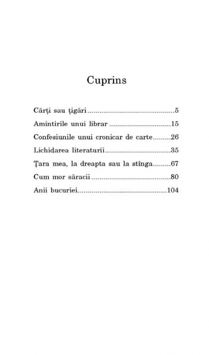 Un volum remarcabil de eseuri si texte publicistice semnate de bine-cunoscutul autor al bestsellerurilor O mie noua sute optzeci si patru si Ferma Animalelor. Traducere din limba engleza si note Ciprian Siulea Volumul Carti sau tigari include o serie de eseuri si texte publicistice in care autorul britanic abordeaza, cu bine-cunoscuta sa incisivitate si umorul lui subtil, teme mai mult sau mai putin grave. Interesul redus pentru lectura al oamenilor obisnuiti (comentat in textul cu titlul explicit Carti sau tigari), atmosfera mizera dintr-un spital frantuzesc interbelic, zbaterile ridicole ale unui cronicar de carte sau slaba reactie a scriitorilor occidentali fata de starea literaturii din Uniunea Sovietica sint doar citeva din subiectele abordate de Orwell intr-un demers in care dimensiunea etica e dublata de talentul jurnalistic si literar al acestui mare prozator din secolul XX. „Nu exista nici un inlocuitor pentru George Orwell, asa cum nu exista nici un inlocuitor pentru Bernard Shaw sau Mark Twain... El a zgindarit, a provocat si a iritat mintile lenese, dar i-a si incintat pe cei carora le facea placere sa urmareasca spectacolul unei gindiri originale.” (Time) Cartea recomandata de