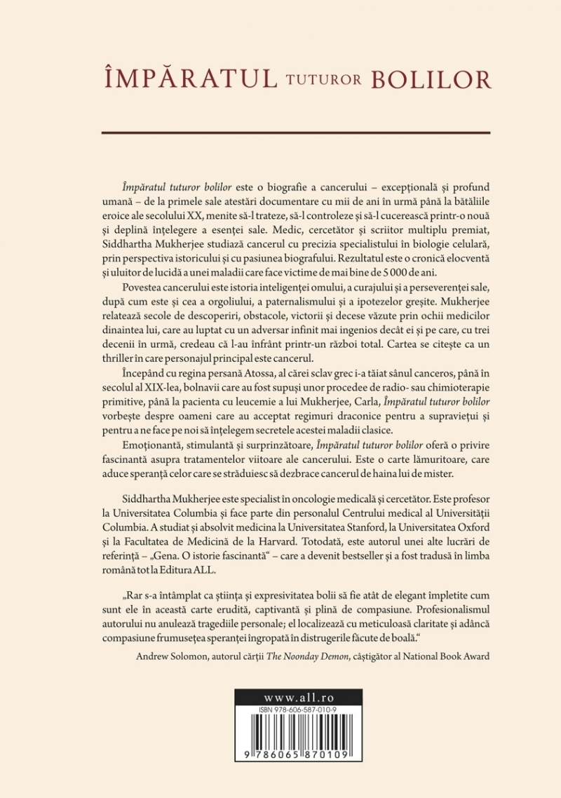 Împăratul tuturor bolilor este o biografie a cancerului – excepţională şi profund umană – de la primele sale atestări documentare cu mii de ani în urmă până la bătăliile eroice ale secolului XX, menite să-l trateze, să-l stăpânească şi să-l cucerească printr-o nouă şi deplină înţelegere a esenţei sale. Medic, cercetător şi scriitor multiplu premiat, Siddhartha Mukherjee studiază cancerul cu precizia specialistului în biologie celulară, prin perspectiva istoricului şi cu pasiunea biografului. Rezultatul este o cronică elocventă şi uimitor de lucidă a unei maladii care face victime de mai bine de 5 000 de ani.