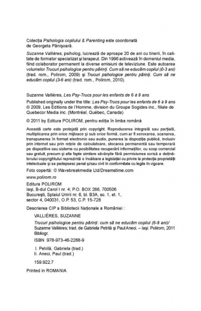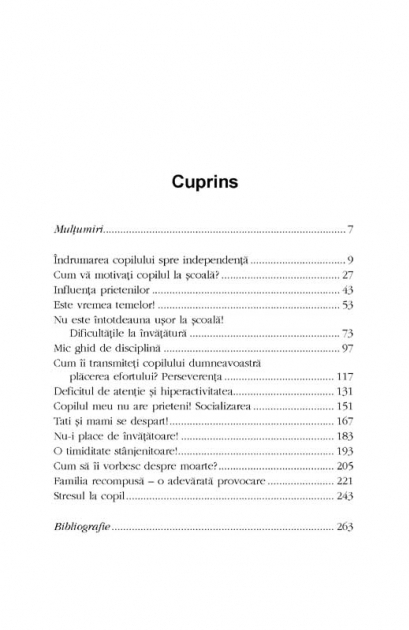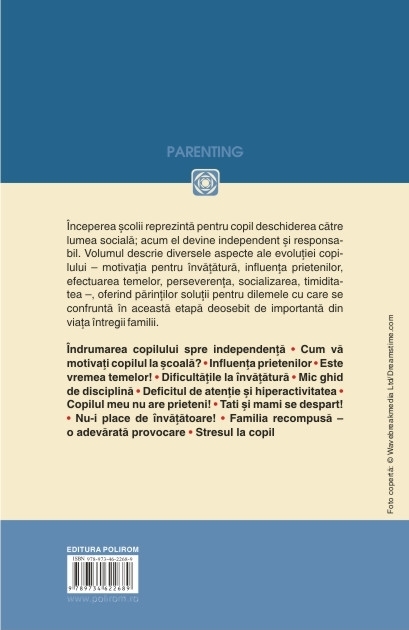 Traducere de Gabriela Petrila si Paul Aneci Inceperea scolii reprezinta pentru copil deschiderea catre lumea sociala; acum el devine independent si responsabil. Volumul descrie diversele aspecte ale evolutiei copi-lului – motivatia pentru invatatura, influenta prietenilor, efectuarea temelor, perseverenta, socializarea, timiditatea –, oferind parintilor solutii pentru dilemele cu care se confrunta in aceasta etapa deosebit de importanta din viata intregii familii.