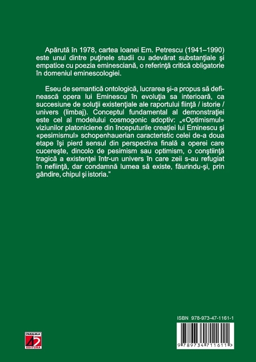 Aparuta in 1978, cartea Ioanei Em. Petrescu (1941-1990) este unul dintre putinele studii cu adevarat sebstantiale si empatice cu poezia eminesciana, o referinta critica obligatorie in domeniul eminescologiei. Eseu de semantica ontologica, lucrarea si-a propus sa defineasca opera lui Eminescu in evolutia sa interioara, ca succesiune de solutii existentiale ale raportului fiinta / istorie / univers (limbaj). Conceptul fundamental al demonstratiei este cel al modelului cosmogonic adoptiv: `Optimismul viziunilor platoniciene din inceputurile creatiei lui Eminescu si pesimismul schopenhauerian caracteristic celei de-a doua etape isi pierd sensul din perspectiva finala a operei care cucereste, dincolo de pesimism sau optimism, o constiinta tragica a existentei intr-un univers in care zeii s-au refugiat in nefiinta, dar condamna lumea sa existe, faurindu-si, prin gandire, chipul si istoria`.
