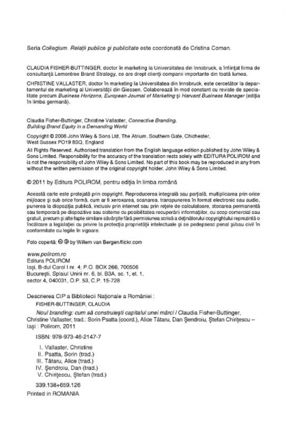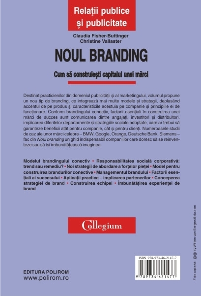 Traducere de Sorin Psatta (coord.), Alice Tataru, Dan Sendroiu, Stefan Chiritescu Destinat practicienilor din domeniul publicitatii si al marketingului, volumul propune un nou tip de branding, ce integreaza mai multe modele si strategii, deplasind accentul de pe produs si caracteristicile acestuia pe companie si principiile ei de functionare. Conform brandingului conectiv, factorii esentiali in construirea unei marci de succes sint comunicarea dintre angajati, investitori si distribuitori, implicarea diferitelor departamente si strategiile sociale adoptate, care ar trebui sa garanteze beneficii atit pentru companie, cit si pentru clienti. Numeroasele studii de caz ale unor marci celebre – BMW, Google, Orange, Deutsche Bank, Siemens – fac din Noul branding un ghid indispensabil companiilor care doresc sa se reinventeze sau sa isi imbunatateasca imaginea.
