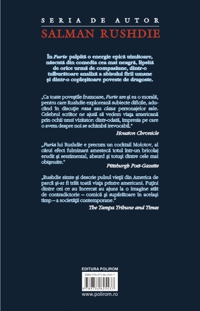 Editia a IV‑a, revizuita Traducere din limba engleza si note de Vlad Russo In Furie palpita o energie epica uimitoare, nascuta din comedia cea mai neagra, lipsita de orice urma de compasiune, dintr-o tulburatoare analiza a abisului firii umane si dintr-o coplesitoare poveste de dragoste. Profesorul Malik Solanka, protagonistul romanului Furie, istoric al ideilor si plasmuitor de papusi de renume mondial, decide intr‑o zi sa‑si abandoneze viata si familia de la Londra, fara nici o explicatie, si sa evadeze la New York. Solanka simte in taina o furie nimicitoare indreptata impotriva tuturor si se teme ca ii va scapa la un moment dat de sub control, intorcindu‑se impotriva celor dragi. Soseste la New York intr‑o epoca de aur a consumului, cind America se afla in culmea bogatiei si puterii ei, si incearca sa se piarda pe sine in efervescenta vietii din jur. Insa oriunde merge, il intimpina aceeasi furie. Undeva in oras, un ucigas in serie incepe sa faca victime printre fetele frumoase si stilate din mediul exclusivist al celor bogati, iar crimele par sa coincida in mod ciudat cu anumite episoade de amnezie prin care trece profesorul Solanka. „Ca toate povestile frumoase, Furie are si ea o morala, pentru care Rushdie exploreaza subiecte dificile, aducind in discutie rasa sau clasa personajelor sale. Celebrul scriitor ne ajuta sa vedem viata americana prin ochii unui vizitator: dintr-odata, impresia pe care o avem despre noi se schimba irevocabil.” (Houston Chronicle) „Furia lui Rushdie e precum un cocktail Molotov, al carui efect fulminant amesteca totul intr-un bricolaj erudit si sentimental, absurd si totusi dintre cele mai obisnuite.” (Pittsburgh Post-Gazette) „Rushdie simte si descrie pulsul vietii din America de parca si-ar fi trait toata viata printre americani. Putini dintre cei ce au incercat au ajuns la o imagine atit de contradictorie – comica si suparatoare in acelasi timp – a societatii contemporane.” (The Tampa Tribune and Times)