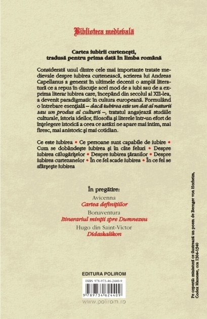 Editie bilingva Traducere si note de Eugenia Cristea Studiu, nota introductiva, note si bibliografie de Anca Crivat Cartea iubirii curtenesti, tradusa pentru prima data in limba romana Considerata unul dintre cele mai importante tratate medievale despre iubirea curteneasca, scrierea lui Andreas Capellanus a generat in ultimele decenii o ampla literatura ce a repus in discutie acel mod de a iubi sau de a exprima literar iubirea care, incepind din secolul al XII-lea, a devenit paradigmatic in cultura europeana. Formulind o intrebare esentiala – daca iubirea este un dat al naturii sau un produs al culturii –, tratatul angajeaza studiile culturale, istoria ideilor, filosofia si literele intr-un efort de intelegere istorica a ceea ce astazi ne apare mai intim, mai firesc, mai anistoric si mai cotidian.