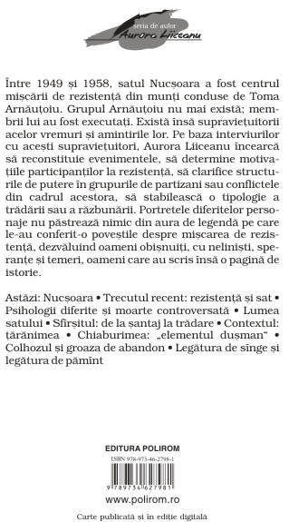 O noua editie a volumului Ranile memoriei, semnat de Aurora Liiceanu, cel mai cunoscut psiholog autohton si una dintre cele mai de succes autoare publicate de Editura Polirom in ultimii ani. Intre 1949 si 1958, satul Nucsoara a fost centrul miscarii de rezistenta din munti conduse de Toma Arnautoiu. Grupul Arnautoiu nu mai exista; membrii lui au fost executati. Exista insa supravietuitorii acelor vremuri si amintirile lor. Pe baza interviurilor cu acesti supravietuitori, Aurora Liiceanu incearca sa reconstituie evenimentele, sa determine motivatiile participantilor la rezistenta, sa clarifice structurile de putere in grupurile de partizani sau conflictele din cadrul acestora, sa stabileasca o tipologie a tradarii sau a razbunarii. Portretele diferitelor personaje nu pastreaza nimic din aura de legenda pe care le-au conferit-o povestile despre miscarea de rezistenta, dezvaluind oameni obisnuiti, cu nelinisti, sperante si temeri, oameni care au scris insa o pagina de istorie. Din cuprins: Astazi: Nucsoara • Trecutul recent: rezistenta si sat • Psihologii diferite si moarte controversata • Lumea satului • Sfirsitul: de la santaj la tradare • Contextul: taranimea • Chiaburimea: „elementul dusman” • Colhozul si groaza de abandon • Legatura de singe si legatura de pamint
