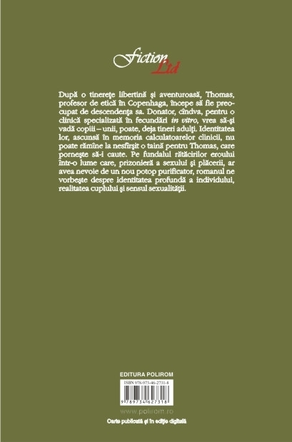 Dupa o tinerete libertina si aventuroasa, Thomas, profesor de etica in Copenhaga, incepe sa fie preocupat de descendenta sa. Donator, cindva, pentru o clinica specializata in fecundari in vitro, vrea sa-si vada copiii —unii, poate, deja tineri adulti. Identitatea lor, ascunsa in memoria calculatoarelor clinicii, nu poate ramine la nesfirsit o taina pentru Thomas, care porneste sa-i caute. Pe fundalul ratacirilor eroului intr-o lume care, prizoniera a sexului si placerii, ar avea nevoie de un nou potop purificator, romanul ne vorbeste despre identitatea profunda a individului, realitatea cuplului si sensul sexualitatii.
