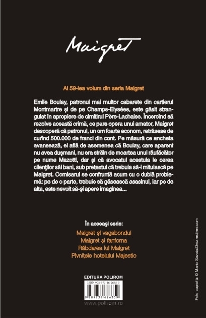 Emile Boulay, patronul mai multor cabarete din cartierul Montmartre si de pe Champs-Elysées, este gasit strangulat in apropiere de cimitirul Père-Lachaise. Incercind sa rezolve aceasta crima, ce pare opera unui amator, Maigret descopera ca patronul, un om foarte econom, retrasese de curind 500.000 de franci din cont. Pe masura ce ancheta avanseaza, el afla de asemenea ca Boulay, care aparent nu avea dusmani, nu era strain de moartea unui raufacator pe nume Mazotti, dar si ca avocatul acestuia le cerea clientilor sai bani, sub pretextul ca trebuia sa-l mituiasca pe Maigret. Comisarul se confrunta acum cu o dubla problema: pe de o parte, trebuie sa gaseasca asasinul, iar pe de alta, este nevoit sa-si apere imaginea...