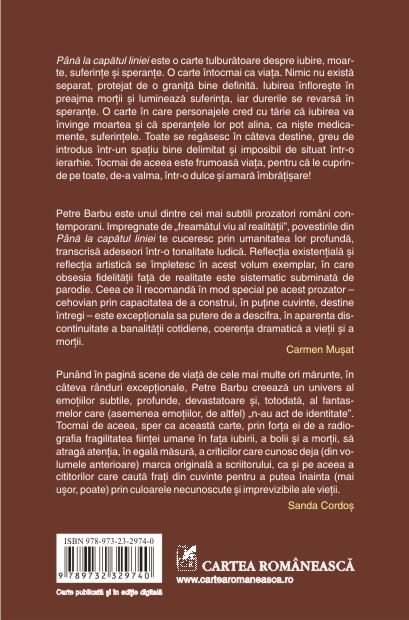 Pina la capatul liniei este o carte tulburatoare despre iubire, moarte, suferinte si sperante. O carte intocmai ca viata. Nimic nu exista separat, protejat de o granita bine definita. Iubirea infloreste in preajma mortii si lumineaza suferinta, iar durerile se revarsa in sperante. O carte in care personajele cred cu tarie ca iubirea va invinge moartea si ca sperantele lor pot alina, ca niste medicamente, suferintele. Toate se regasesc in citeva destine, greu de introdus intr-un spatiu bine delimitat si imposibil de situat intr-o ierarhie. Tocmai de aceea este frumoasa viata, pentru ca le cuprinde pe toate, de-a valma, intr-o dulce si amara imbratisare! „Petre Barbu este unul dintre cei mai subtili prozatori romani contemporani. Impregnate de «freamatul viu al realitatii», povestirile din Pina la capatul liniei te cuceresc prin umanitatea lor profunda, transcrisa adeseori intr-o tonalitate ludica. Reflectia existentiala si reflectia artistica se impletesc in acest volum exemplar, in care obsesia fidelitatii fata de realitate este sistematic subminata de parodie. Ceea ce il recomanda in mod special pe acest prozator – cehovian prin capacitatea de a construi, in putine cuvinte, destine intregi – este exceptionala sa putere de a descifra, in aparenta discontinuitate a banalitatii cotidiene, coerenta dramatica a vietii si a mortii.” (Carmen Musat) „Punind in pagina scene de viata de cele mai multe ori marunte, in citeva rinduri exceptionale, Petre Barbu creeaza un univers al emotiilor subtile, profunde, devastatoare si, totodata, al fantasmelor care (asemenea emotiilor, de altfel) «n-au act de identitate». Tocmai de aceea, sper ca aceasta carte, prin forta ei de a radiografia fragilitatea fiintei umane in fata iubirii, a bolii si a mortii, sa atraga atentia, in egala masura, a criticilor care cunosc deja (din volumele anterioare) marca originala a scriitorului, ca si pe aceea a cititorilor care cauta frati din cuvinte pentru a putea inainta (mai usor, poate) prin culoarele necunoscute si imprevizibile ale vietii.” (Sanda Cordos)