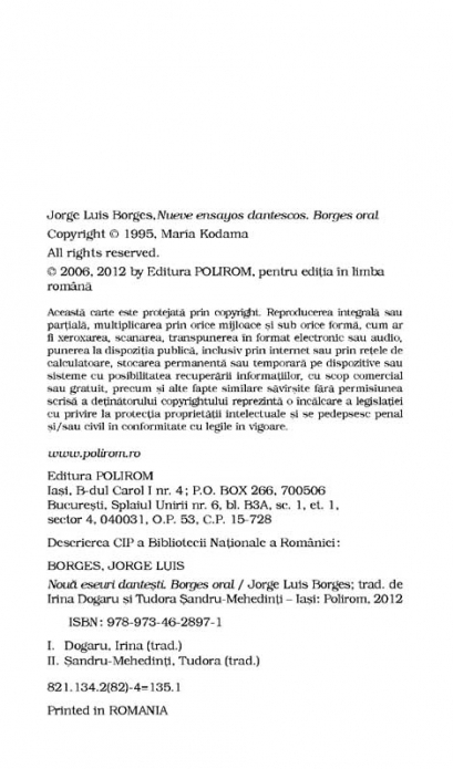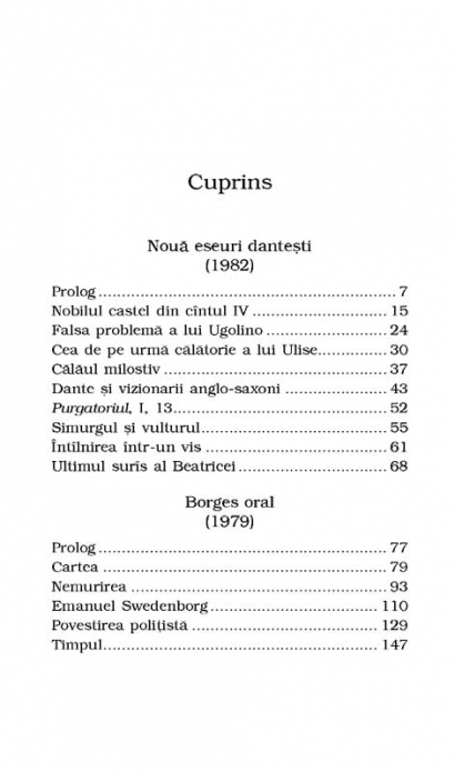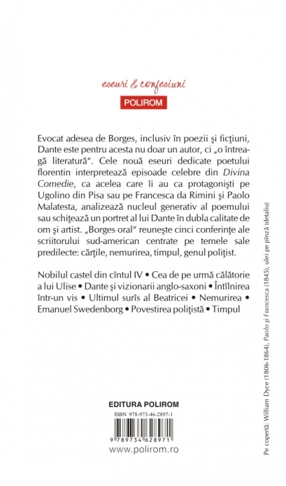 Traduceri de Irina Dogaru si Tudora Sandru‑Mehedinti Eseurile, conferintele si studiile scriitorului argentinian, adevarate capodopere ale genului, dobindesc, prin finete, ascutimea analizei si fantezia argumentatiei, aspectul unor piese literare veritabile. Evocat adesea de Borges, inclusiv in poezii si fictiuni, Dante este pentru acesta nu doar un autor, ci „o intreaga literatura”. Cele noua eseuri dedicate poetului florentin interpreteaza episoade celebre din Divina Comedie, ca acelea care ii au ca protagonisti pe Ugolino din Pisa sau pe Francesca da Rimini si Paolo Malatesta, analizeaza nucleul generativ al poemului sau schiteaza un portret al lui Dante in dubla calitate de om si artist. „Borges oral” reuneste cinci conferinte ale scriitorului sud-american centrate pe temele sale predilecte: cartile, nemurirea, timpul, genul politist. Din cuprins: Nobilul castel din cintul IV • Cea de pe urma calatorie a lui Ulise • Dante si vizionarii anglo-saxoni • Intilnirea intr-un vis • Ultimul suris al Beatricei • Nemurirea • Emanuel Swedenborg • Povestirea politista • Timpul