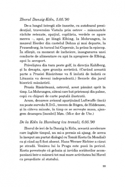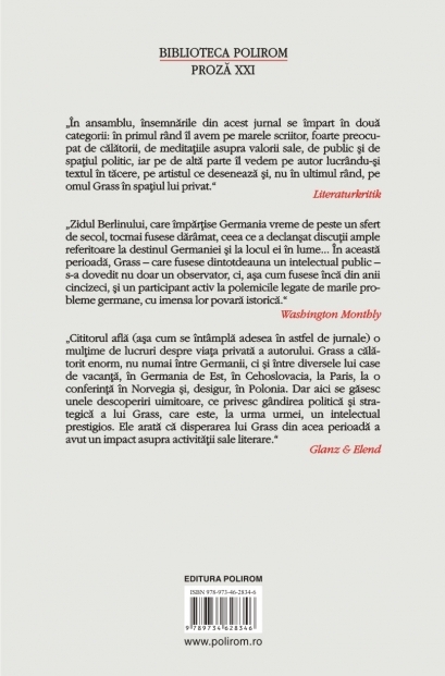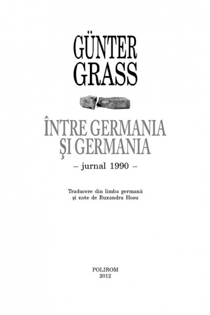 Traducere din limba germana si note de Ruxandra Hosu Premiul Nobel pentru Literatura (1999) Intre Germania si Germania, jurnalul lui Gunter Grass dintr-un an crucial pentru istoria tarii sale, anul reunificarii celor doua state germane, R.F.G. si R.D.G, este o relatare la cald a evenimentelor din 1990, reflectate in constiinta autorului, dar si o marturie despre activitatea artistica si viata personala a acestuia. Artist polivalent, membru al SPD, Gunter Grass poarta polemici de pe pozitii ferme, calatoreste, publica, deseneaza, se intilneste cu personalitati ale vietii culturale, cu membri ai numeroasei sale familii si, concomitent, lucreaza la noi proiecte. Paginile din acest jurnal ofera o imagine asupra atelierului creativ al artistului si a felului in care se nasc si se dezvolta povestile cu care Grass a cucerit un public larg in intreaga lume. „In ansamblu, insemnarile din acest jurnal se impart in doua categorii: in primul rind il avem pe marele scriitor, foarte preocupat de calatorii, de meditatiile asupra valorii sale, de public si de spatiul politic, iar pe de alta parte il vedem pe autor lucrindu-si textul in tacere, pe artistul ce deseneaza si, nu in ultimul rind, pe omul Grass in spatiul lui privat.” (Literaturkritik) „Zidul Berlinului, care impartise Germania vreme de peste un sfert de secol, tocmai fusese darimat, ceea ce a declansat discutii ample referitoare la destinul Germaniei si la locul ei in lume... In aceasta perioada, Grass – care fusese dintotdeauna un intelectual public –s-a dovedit nu doar un observator, ci, asa cum fusese inca din anii cincizeci, si un participant activ la polemicile legate de marile probleme germane, cu imensa lor povara istorica.” (Washington Monthly) „Cititorul afla (asa cum se intimpla adesea in astfel de jurnale) o multime de lucruri despre viata privata a autorului. Grass a calatorit enorm, nu numai intre Germanii, ci si intre diversele lui case de vacanta, in Germania de Est, in Cehoslovacia, la Paris, la o conferinta in Norvegia si, desigur, in Polonia. Dar aici se gasesc unele descoperiri uimitoare, ce privesc gindirea politica si strategica a lui Grass, care este, la urma urmei, un intelectual prestigios. Ele arata ca disperarea lui Grass din acea perioada a avut un impact asupra activitatii sale literare.” (Glanz & Elend)