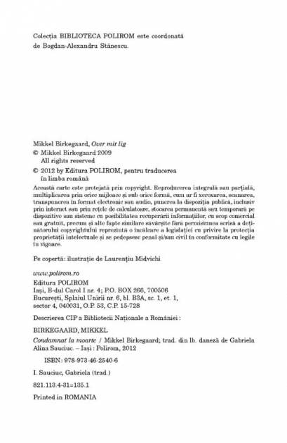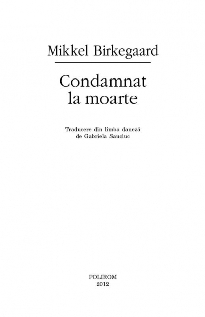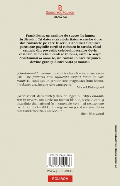 Traducere din limba daneza de Gabriela Sauciuc Autorul bestsellerului international Biblioteca umbrelor (Polirom, 2011), tradus pina in prezent in saptesprezece limbi Frank Føns, un scriitor de succes in lumea thrillerului, isi datoreaza celebritatea scenelor dure din romanele pe care le scrie. Cind insa fictiunea paraseste paginile cartii si coboara in strada, cind crimele din povestile celebrului scriitor devin realitate, lumea lui Frank se tulbura; astfel se naste Condamnat la moarte (2009), un roman in care fictiunea devine granita dintre viatasi moarte. O crima inchisa intre paginile unui roman devine realitate si transforma existenta celui care a asternut‑o pe hirtie. Frank Føns este un autor de romane ce‑si circumscriu spectrul dintre crima si groaza. Faimoase pentru descrierile viscerale si mortile violente, un periplu in lumea ororii, cartile sale nu l‑au pus in fata raspunderii scriitorului pina cind este descoperit cadavrul unei femei al carei ucigas a respectat intocmai ceea ce Frank Føns crease in ultima sa carte, inca nepublicata. Coincidenta este prea mare, Frank isi da seama ca cineva ii foloseste manuscrisul sustras ca ghid pentru a ucide. Singura cale pentru a pune capat crimelor este sa devina detectiv, misiune complicata, cu atit mai mult cu cit trebuie sa se descurce pe cont propriu. Condamnat la moarte reuseste sa captiveze cititorul prin complexitatea protagonistului, prin depasirea cliseului horror, prin problemele pe care le pune – responsabilitatea artistului, atunci cind realitatea imita arta, iar editorii urmaresc doar sporirea vinzarilor – si prin finalul straniu. „Condamnat la moarte pune cititorilor sai o intrebare esentiala: Are fantezia vreo influenta asupra lumii in care traim? Ei, cind esti un scriitor care imagineaza lumi horror, intrebarea asta incepe sa te cam sperie.” (Mikkel Birkegaard) „Avertisment: daca sinteti slabi de inger, nu cititi Condamnat la moarte. Imaginile nu tocmai blinde, scenele care-si dezvaluie dramatismul in momentele cele mai neasteptate fac din cartea lui Mikkel Birkegaard un pol al suspansului in care timiditatea nu-si are locul.” (Rich Westwood) Carte recomandata de: