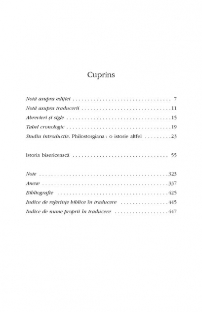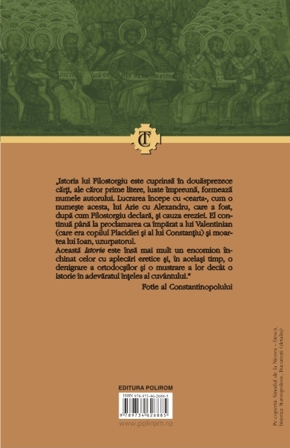Editie bilingva Traducere de Dorin Garofeanu Studiu introductiv, tabel cronologic si note explicative de Dragos Mirsanu Editie ingrijita de Adrian Muraru Volumul reconstituie istoria bisericeasca a veacurilor patru si cinci din perspectiva „eretica”: autorul, arian, a fost pedepsit printr-o damnatio memoriae care a presupus eliminarea cartilor sale din bibliotecile medievale. In mod curios, un rezumat al acestei istorii „eretice” este facut de Fotie, un patriarh al Constantinopolului din secolul al IX-lea, iar acestui rezumat i se adauga fragmente a caror origine pare sa se afle in Istoria bisericeasca a lui Filostorgiu si care s-au pastrat in alte opere medievale. Astfel accesibila, Istoria este plina de surprize: in ea imparatul Constantin I moare nu din pricina unei boli, asa cum ne invata vulgata istorica, ci otravit intr-un complot pus la cale de propriii frati, Asia si Africa sint descrise in tonul comun al acelor mirabilia medievale, paradisul este plasat spre Rasarit, intre Eufrat si Tigru. Disputele bisericesti sint surprinse din perspectiva ariana, insa Istoria bisericeasca a lui Filostorgiu ramine esentiala pentru cunoasterea intervalului 300-425, fiind prin excelenta sursa primara a acestuia. „Istoria lui Filostorgiu este cuprinsa in douasprezece carti, ale caror prime litere, luate impreuna, formeaza numele autorului. Lucrarea incepe cu «cearta», cum o numeste acesta, lui Arie cu Alexandru, care a fost, dupa cum Filostorgiu declara, si cauza ereziei. El continua pina la proclamarea ca imparat a lui Valentinian (care era copilul Placidiei si al lui Constantiu) si moartea lui Ioan, uzurpatorul. Aceasta Istorie este insa mai mult un encomion inchinat celor cu aplecari eretice si, in acelasi timp, o denigrare a ortodocsilor si o mustrare a lor decit o istorie in adevaratul inteles al cuvintului.” (Fotie al Constantinopolului)