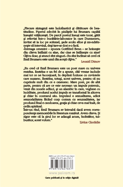 Al treilea volum din operele lui Emil Brumaru contine corespondenta autorului cu citiva dintre cei mai cunoscuti autori din literatura si critica romaneasca. Scrisorile sale catre Lucian Raicu, Alex. Stefanescu, Leonid Dimov, Serban Foarta, Radu Petrescu, Florin Mugur sau Ilie Constantin – unele aparute in periodice, altele inedite – deschid o usa spre o lume privita (si redata) uneori ironic, alteori grav, dar intotdeauna cu acea sinceritate ce pare a fi una dintre coordonatele esentiale ale autorului. „Fiecare sintagma este holofrastica si datatoare de beatitudine. Piperul zdrobit in piulitele lui Brumaru capata insusiri vrajitoresti. De parca poetul insusi este tocat, gatit si reinviat intr-o bucatarie-laborator in care Dumnezeu, invitat sa ia loc pe scaunel, sade acolo sfios si nu-ndrazneste sa intervina, desi tare-ar dori s-o faca. «Intreaga omenire – spunea Gottfried Benn – se hraneste din citeva intilniri cu sine, dar cine se intilneste cu sine? Citiva doar, si atunci sint singuri.» Eu sint inclinat sa cred ca Emil Brumaru este unul din acesti citiva.” (Leonid Dimov) „Eu cred ca Emil Brumaru este un poet mare cu univers restrins. Restrins e un fel de a spune, cita vreme include mai tot ce ne inconjoara, in deplina fuziune cu cuvintele care numesc. Restrins, totusi, acest univers, pentru ca nu cuprinde mult din ce e omenesc. Mare poet, pe de alta parte, pentru ca are ce este necesar: un impuls puternic, venit din zonele adinci, si un alambic in care, vegheat cu luciditate, produsul acelui impuls se transforma in altceva si chiar in contrarul sau. Impulsul e sexualitatea, adica senzorialitatea facind corp comun cu senzualitatea, iar produsul final e candoarea, gratia si chiar ceva mai inalt, de ordin spiritual. Intr-un rind, Emil Brumaru se intreaba daca avem corespondente memorabile in literatura romana. Avem citeva. Si sigur este ca la sirul lor se adauga acum, incintator, tulburator, acest volum.” (Livius Ciocarlie)