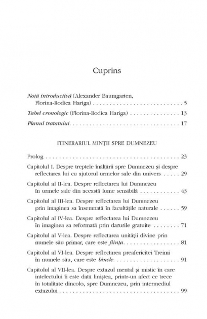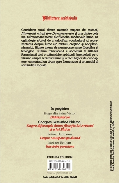 Considerat unul dintre tratatele majore de mistica, Itinerariul mintii spre Dumnezeu este si una dintre cele mai tulburatoare lucrari ale filosofiei medievale latine. Aceasta oglindeste efortul de a valorifica vocabularul si reprezentarea despre lume ale misticii crestine si neoplatonismului, filtrate intens de numeroase surse filosofice si teologice. Cultura franciscana a secolului al XIII-lea formuleaza aici o marturisire spirituala intemeiata pe o viziune asupra ierarhiei lumii si a facultatilor de cunoastere, conturind un drum spre Dumnezeu si un model al rectitudinii morale.
