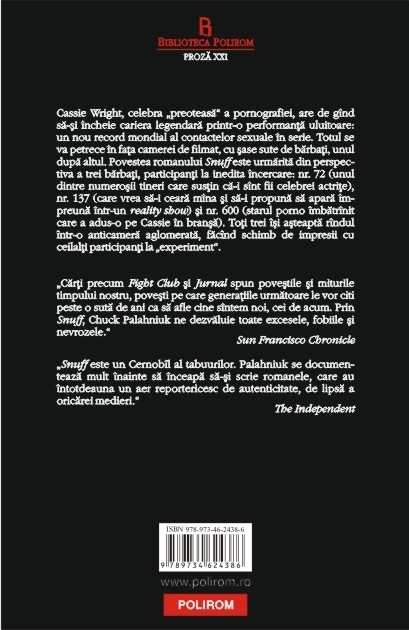 „Carti precum Fight Club si Jurnal spun povestile si miturile timpului nostru, povesti pe care generatiile urmatoare le vor citi peste o suta de ani ca sa afle cine sintem noi, cei de acum. Prin Snuff, Chuck Palahniuk ne dezvaluie toate excesele, fobiile si nevrozele.” (Sun Francisco Chronicle)
