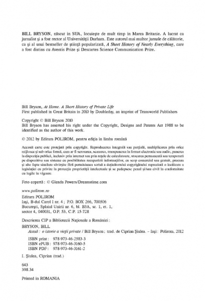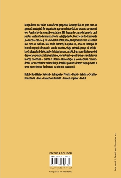 Vizualizati recenzia cartii in emisiunea "Omul care aduce cartea" Traducere de Ciprian Siulea Multi dintre noi traim in confortul propriilor locuinte fara sa stim cum au ajuns sa arate si sa fie organizate asa cum sint astazi, cu tot ceea ce cuprind ele. Pornind de la aceasta constatare, Bill Bryson ia ca model propria casa pentru a reface indelungata istorie a vietii private. Descrie pe rind camerele si obiectele din ele si ne arata in tot atitea povesti captivante cum au aparut sau cum au evoluat. Mai mult, intrucit, in opinia sa, orice se intimpla in lume incepe si sfirseste in casele noastre, viata privata ajunge sa prilejuiasca digresiuni delectabile in istoria mare. Astfel, baia constituie punctul de plecare pentru o istorie a igienei, dormitorul – pentru una a sexului sau a mortii, bucataria – pentru o istorie a alimentatiei si a comertului cu mirodenii. Iar anecdotica volumului si detaliile picante despre viata privata a unor nume ilustre fac lectura cu atit mai savuroasa. Din cuprins: Holul • Bucataria • Salonul • Sufrageria • Pivnita • Biroul • Gradina • Scarile • Dormitorul • Baia • Camera de toaleta • Camera copiilor • Podul