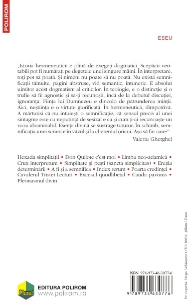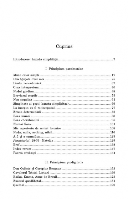 Din cuprins: Hexada simplitatii • Don Quijote c’est moi • Limba neo-adamica • Crux interpretum • Simplitate si pesti (sancta simplicitas) • Erezia determinarii • A fi si a semnifica • Index rerum • Poarta credintei • Cavalerul Tristei Lecturi • Excesul quodlibetal • Cauda pavonis • Pleonasmul divin