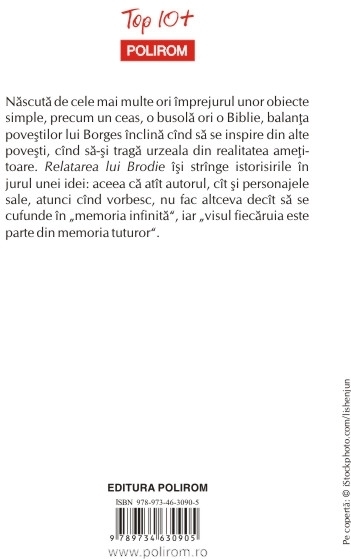 Traducere si note de Cristina Haulica si Andrei Ionescu Nascuta de cele mai multe ori imprejurul unor obiecte simple, precum un ceas, o busola ori o Biblie, balanta povestilor lui Borges inclina cind sa se inspire din alte povesti, cind sa-si traga urzeala din realitatea ametitoare. Relatarea lui Brodie isi stringe istorisirile in jurul unei idei: aceea ca atit autorul, cit si personajele sale, atunci cind vorbesc, nu fac altceva decit sa se cufunde in „memoria infinita”, iar „visul fiecaruia este parte din memoria tuturor”.