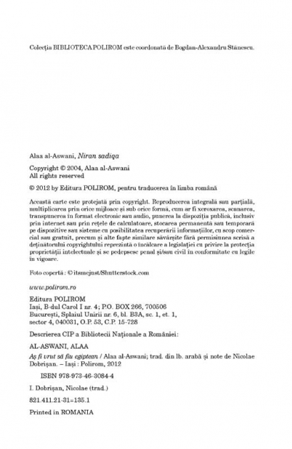 Traducere din limba araba si note de Nicolae Dobrisan Refuzat multa vreme de editori din cauza continutului subversiv, care le-ar fi putut atrage o condamnare la inchisoare, volumul As fi vrut sa fiu egiptean este o diatriba la adresa societatii egiptene moderne, macinate de coruptie, ipocrizie, violenta si depravare, ce inabusa in fasa inteligenta si talentul. Al-Aswani demonteaza sistematic afirmatia bombastica a politicianului Mustafa Kamil, care pretinde ca: „Daca n-as fi fost egiptean, as fi vrut sa fiu egiptean”, si dezbraca in intregime locuitorii de astazi ai Egiptului de aura in care ii invaluie trecutul glorios. Egipteanul modern, asa cum il vedem ilustrat in personajele sale, nu mai pastreaza nici macar o vaga legatura cu marii faraoni sau cu ingeniosii constructori de piramide, ci este o fiinta fatarnica, lenesa, lacoma si brutala, ce pare sa descinda mai degraba din cei mai umili sclavi. „Intocmai ca Rusia lui Dostoievski sau America lui Steinbeck, Egiptul lui Alaa al-Aswani este o metafora a lumii. Dentist in timpul zilei, autorul Blocului Iakubian a frecventat multa vreme, indata dupa caderea noptii, locurile cele mai stranii si uneori cele mai nelinistitoare din Cairo. Astfel a intilnit «politicieni pensionati si fosti printi faliti, alcoolici si recidivisti, femei decazute si fanatici religiosi, pungasi, sefi de bande si fel de fel de haidamaci». Romancier in adincul sufletului, isi facea provizii de tipologii umane. Pe acestea le regasim transpuse astazi in povestirile sale de un realism impresionant.” (Le Magazine littéraire)