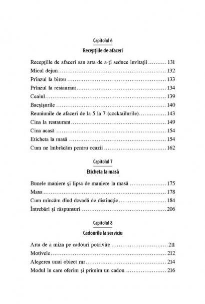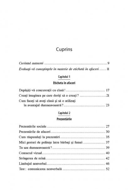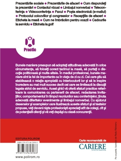 Traducere de Geanina Serban Bunele maniere presupun sa adoptati atitudinea adecvata in orice circumstante, sa folositi corect tacimul la masa, sa purtati o discutie politicoasa si multe altele. In mediul profesional, bunele maniere sint la fel de importante ca in viata de zi cu zi. Cei care stiu sa stabileasca o relatie apropiata cu interlocutorii lor si sa le inspire incredere au mai mult succes decit cei care se limiteaza la discutii legate strict de serviciu. Acest ghid va ofera sfaturi practice referitoare la comunicarea cu partenerii de afaceri, redactarea invitatiilor, comportamentul in timpul reuniunilor sau conferintelor, tinuta adecvata diferitelor evenimente si limbajul nonverbal. Cu ajutorul desenelor si exemplelor care ilustreaza aceste sfaturi si al testelor propuse, veti deveni niste profesionisti apreciati atit de colegi, cit si de potentialii clienti si va veti depasi cu clasa concurentii. Din cuprins: Prezentarile sociale • Prezentarile de afaceri • Cum raspundeti la prezentari • Contactul vizual • Limbajul nonverbal • Teleconferinta • Videoconferinta • Faxul • Posta electronica (e-mailul) • Protocolul colocviilor si congreselor • Receptiile de afaceri • Eticheta la masa • Cum ne imbracam pentru ocazii • Cadourile la serviciu • Eticheta la golf Carte recomandata de: