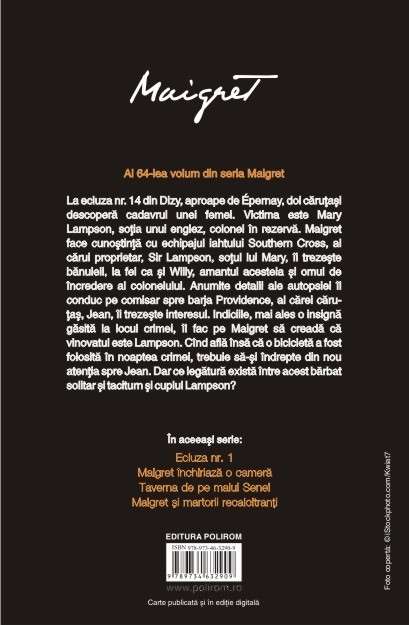 Al 64-lea volum din seria Maigret Traducere de Nicolae Constantinescu La ecluza nr. 14 din Dizy, aproape de Épernay, doi carutasi descopera cadavrul unei femei. Victima este Mary Lampson, sotia unui englez, colonel in rezerva. Maigret face cunostinta cu echipajul iahtului Southern Cross, al carui proprietar, Sir Lampson, sotul lui Mary, ii trezeste banuieli, la fel ca si Willy, amantul acesteia si omul de incredere al colonelului. Anumite detalii ale autopsiei il conduc pe comisar spre barja Providence, al carei carutas, Jean, ii trezeste interesul. Indiciile, mai ales o insigna gasita la locul crimei, il fac pe Maigret sa creada ca vinovatul este Lampson. Cind afla insa ca o bicicleta a fost folosita in noaptea crimei, trebuie sa-si indrepte din nou atentia spre Jean. Dar ce legatura exista intre acest barbat solitar si taciturn si cuplul Lampson?
