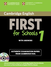 Cambridge English First for Schools 1 contains four tests for the First for Schools exam, also known as First Certificate in English (FCE) for Schools. Cambridge English: First for Schools 1 contains four complete, authentic tests for the First for Schools exam from Cambridge ESOL. These examination papers provide the most authentic exam preparation available, allowing candidates to familiarise themselves with the content of the exam and to practise exam techniques. Colour visual material for Paper 5 is included with each test. This Self-study Pack contains the Student's Book with Answers and Audio CDs (2).