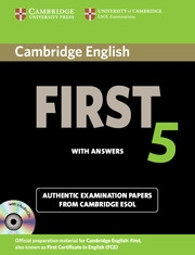 Cambridge English First 5 contains four tests for the Cambridge English First exam, also known as First Certificate in English (FCE). This collection of past examination papers provides the most authentic exam preparation available. They allow candidates to familiarise themselves with the content and format of the examination and to practise useful examination techniques. This pack contains the Student's Book with answers and Audio CDs. The Student's Book with answers contains a clear explanation of marking and grading, authentic sample answers, transcripts, and frameworks to help with thorough preparation for the Speaking test. The CDs contain the exam Listening material. Audio CDs and Student's Book with or without answers are also available separately.