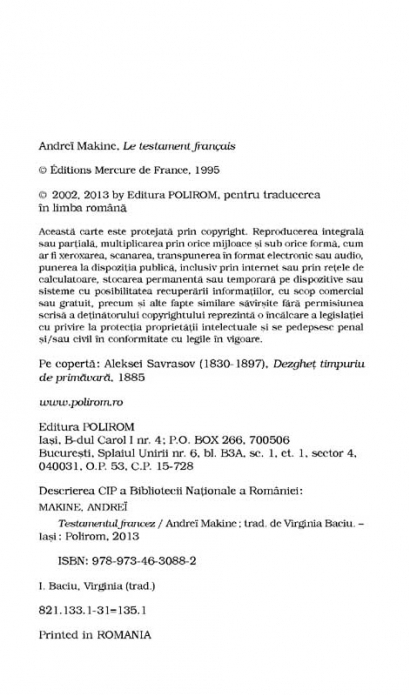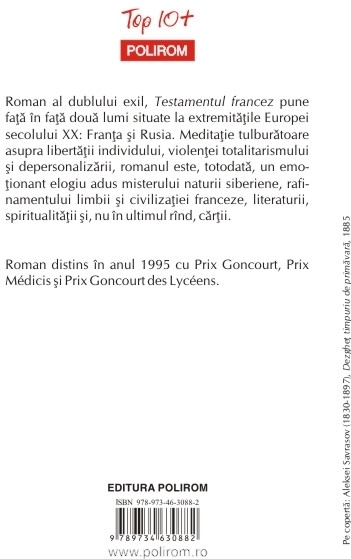 Traducere din limba franceza de Virginia Baciu Roman distins in anul 1995 cu Prix Goncourt, Prix Medicis si Prix Goncourt des Lyceens. Roman al dublului exil, Testamentul francez pune fata in fata doua lumi situate la extremitatile Europei secolului XX: Franta si Rusia. Meditatie tulburatoare asupra libertatii individului, violentei totalitarismului si depersonalizarii, romanul este, totodata, un emotionant elogiu adus misterului naturii siberiene, rafinamentului limbii si civilizatiei franceze, literaturii, spiritualitatii si, nu in ultimul rind, cartii.
