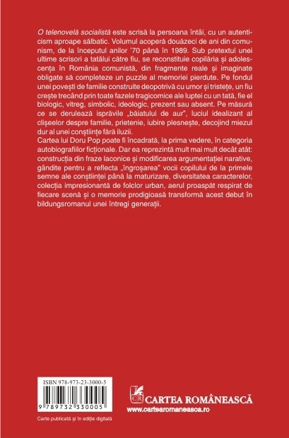 O telenovela socialista este scrisa la persoana intii, cu un autenticism aproape salbatic. Volumul acopera douazeci de ani din comunism, de la inceputul anilor ’70 pina in 1989. Sub pretextul unei ultime scrisori a tatalui catre fiu, se reconstituie copilaria si adolescenta in Romania comunista, din fragmente reale si imaginate obligate sa completeze un puzzle al memoriei pierdute. Pe fondul unei povesti de familie construite deopotriva cu umor si tristete, un fiu creste trecind prin toate fazele tragicomice ale luptei cu un tata, fie el biologic, vitreg, simbolic, ideologic, prezent sau absent. Pe masura ce se deruleaza ispravile „baiatului de aur”, luciul idealizant al cliseelor despre familie, prietenie, iubire plesneste, decojind miezul dur al unei constiinte fara iluzii.