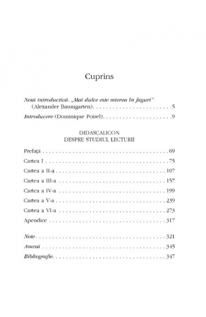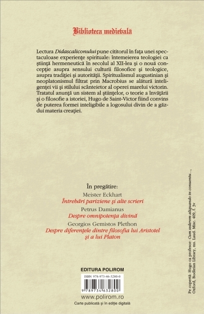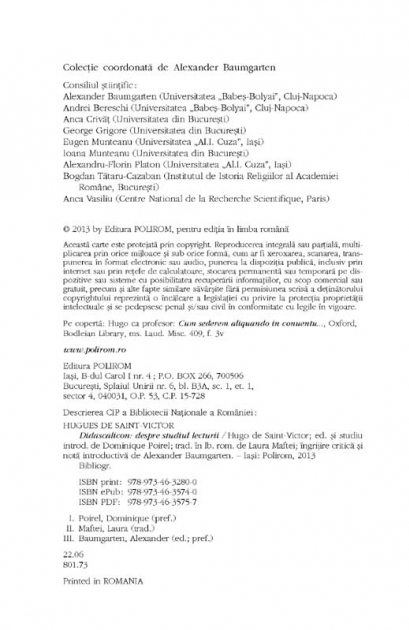 Editie bilingva Text latin stabilit si introducere de Dominique Poirel Traducere in limba romana de Laura Maftei Ingrijire critica si nota introductiva de Alexander Baumgarten Lectura Didascaliconului pune cititorul in fata unei spectaculoase experiente spirituale: intemeierea teologiei ca stiinta hermeneutica in secolul al XII-lea si o noua conceptie asupra sensului culturii filosofice si teologice, asupra traditiei si autoritatii. Spiritualismul augustinian si neoplatonismul filtrat prin Macrobius se alatura inteligentei vii si stilului scinteietor al operei marelui victorin. Tratatul anunta un sistem al stiintelor, o teorie a invatarii si o filosofie a istoriei, Hugo de Saint-Victor fiind convins de puterea formei inteligibile a logosului divin de a gazdui materia creatiei.