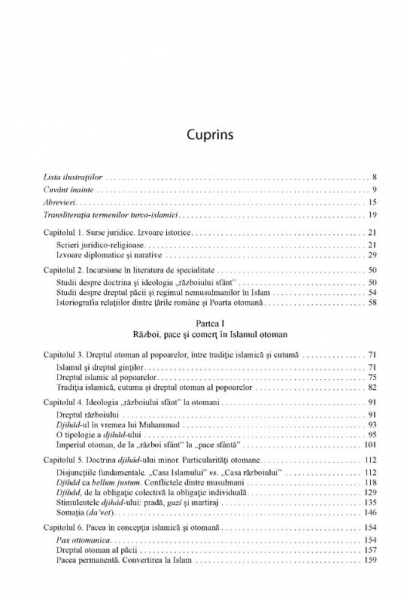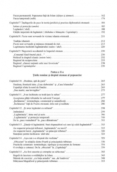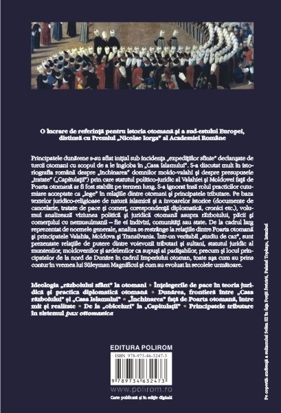 Editia a II-a revazuta si adaugita O lucrare de referinta pentru istoria otomana si a sud-estului Europei, distinsa cu Premiul „Nicolae Iorga” al Academiei Romane Principatele dunarene s-au aflat initial sub incidenta „expeditiilor sfinte” declansate de turcii otomani cu scopul de a le ingloba in „Casa Islamului”. S-a discutat mult in istoriografia romana despre „inchinarea” domnilor moldo-valahi si despre presupusele „tratate” („Capitulatii”) prin care statutul politico-juridic al Valahiei si Moldovei fata de Poarta otomana ar fi fost stabilit pe termen lung. S-a ignorat insa rolul practicilor cutumiare acceptate ca „lege” in relatiile dintre otomani si principatele tributare. Pe baza textelor juridico-religioase de natura islamica si a izvoarelor istorice (documente de cancelarie, tratate de pace si comert, corespondenta diplomatica, cronici etc.), volumul analizeaza viziunea politica si juridica otomana asupra razboiului, pacii si comertului cu nemusulmanii – fie ei indivizi, comunitati sau state. De la cadrul larg reprezentat de normele generale, analiza se restringe la relatiile dintre Poarta otomana si principatele Valahia, Moldova si Transilvania. Intr-un veritabil „studiu de caz”, sint prezentate relatiile de putere dintre voievozii tributari si sultani, statutul juridic al muntenilor, moldovenilor si ardelenilor ca supusi ai padisahilor, precum si locul principatelor de la nord de Dunare in cadrul Imperiului otoman, toate asa cum au prins contur in vremea lui Süleyman Magnificul si cum au evoluat in secolele urmatoare.