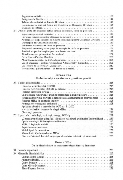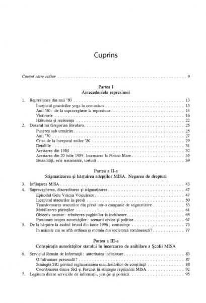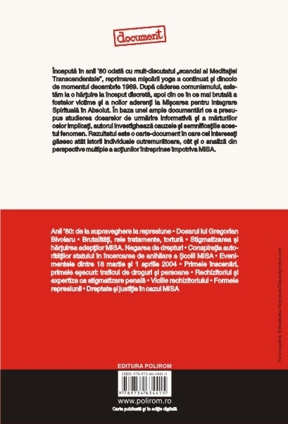 Inceputa in anii ’80 odata cu mult-discutatul „scandal al Meditatiei Transcendentale”, reprimarea miscarii yoga a continuat si dincolo de momentul decembrie 1989. Dupa caderea comunismului, asistam la o hartuire la inceput discreta, apoi din ce in ce mai brutala a fostelor victime si a noilor aderenti la Miscarea pentru Integrare Spirituala in Absolut. In baza unei ample documentari ce a presupus studierea dosarelor de urmarire informativa si a marturiilor celor implicati, autorul investigheaza cauzele si semnificatiile acestui fenomen. Rezultatul este o carte-document in care cei interesati gasesc atit istorii individuale cutremuratoare, cit si o analiza din perspective multiple a actiunilor intreprinse impotriva MISA. Din cuprins: Anii ’80: de la supraveghere la represiune • Dosarul lui Gregorian Bivolaru • Brutalitati, rele tratamente, tortura • Stigmatizarea si hartuirea adeptilor MISA. Negarea de drepturi • Conspiratia autoritatilor statului in incercarea de anihilare a Scolii MISA • Evenimentele dintre 18 martie si 1 aprilie 2004 • Primele inscenari, primele esecuri: traficul de droguri si persoane • Rechizitoriul si expertiza ca stigmatizare penala • Viciile rechizitoriului • Formele represiunii • Dreptate si justitie in cazul MISA