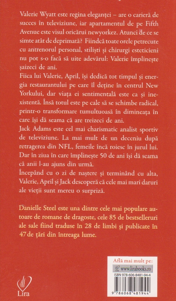 Valerie Wyatt este regina eleganței - are o carieră de succes în televiziune, iar apartamentul de pe Fifth Avenue este visul oricărui newyorkez. Atunci de ce se simte atât de deprimată? Fiindcă toate orele petrecute cu antrenorul personal, stiliști și chirurgi esteticieni nu pot s-o facă să uite adevărul: Valerie împlinește șaizeci de ani. Fiica lui Valerie, April, își dedică tot timpul și energia restaurantului pe care îl deține în centrul New Yorkului, dar viața ei sentimentală este ca și inexistentă. însă totul este pe cale să se schimbe radical, printr-o transformare tumultoasă în dimineața în care își dă seama că are treizeci de ani. Și cu ce se poate lăuda până acum? Jack Adams este cel mai carismatic analist sportiv de televiziune. La mai mult de un deceniu de la retragerea din NFL, femeile încă roiesc în jurul lui. Dar în ziua în care împlinește 50 de ani, realizează că timpul l-a ajuns din urmă. începând cu o zi de naștere și terminând cu alta, Valerie, April și Jack descoperă că cele mai mari daruri ale vieţii sunt mereu o surpriză. Danielle Steel este una dintre cele mai populare autoare de romane de dragoste, cele 85 de bestselleruri ale sale fiind traduse în 28 de limbi și publicate în 47 de țări din întreaga lume.