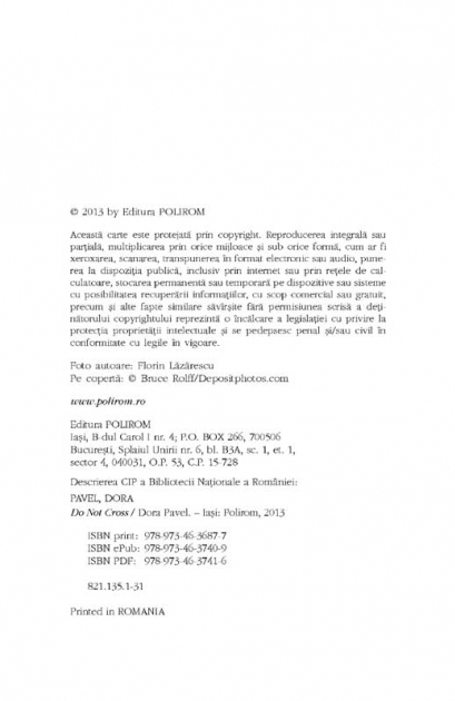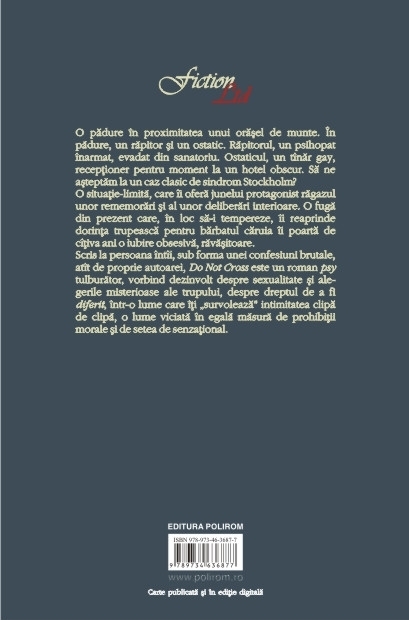 O situatie-limita, care ii ofera junelui protagonist ragazul unor rememorari si al unor deliberari interioare. O fuga din prezent care, in loc sa-i tempereze, ii reaprinde dorinta trupeasca pentru barbatul caruia ii poarta de citiva ani o iubire obsesiva, ravasitoare. Scris la persoana intii, sub forma unei confesiuni brutale, atit de proprie autoarei, Do Not Cross este un roman psy tulburator, vorbind dezinvolt despre sexualitate si alegerile misterioase ale trupului, despre dreptul de a fi diferit, intr-o lume care iti „survoleaza“ intimitatea clipa de clipa, o lume viciata in egala masura de prohibitii morale si de setea de senzational.
