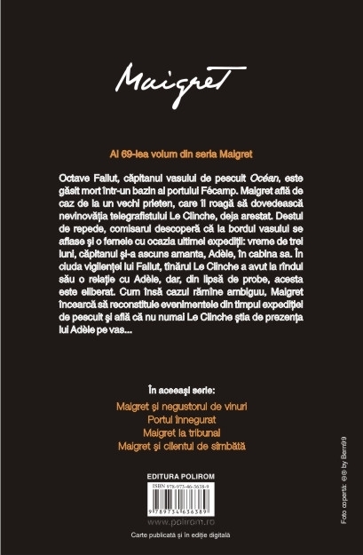 Al 69-lea volum din seria Maigret Traducere de Nicolae Constantinescu Octave Fallut, capitanul vasului de pescuit Ocean, este gasit mort intr-un bazin al portului Fecamp. Maigret afla de caz de la un vechi prieten, care il roaga sa dovedeasca nevinovatia telegrafistului Le Clinche, deja arestat. Destul de repede, comisarul descopera ca la bordul vasului se aflase si o femeie cu ocazia ultimei expeditii: vreme de trei luni, capitanul si-a ascuns amanta, Adèle, in cabina sa. In ciuda vigilentei lui Fallut, tinarul Le Clinche a avut la rindul sau o relatie cu Adèle, dar, din lipsa de probe, acesta este eliberat. Cum insa cazul ramine ambiguu, Maigret incearca sa reconstituie evenimentele din timpul expeditiei de pescuit si afla ca nu numai Le Clinche stia de prezenta lui Adèle pe vas...