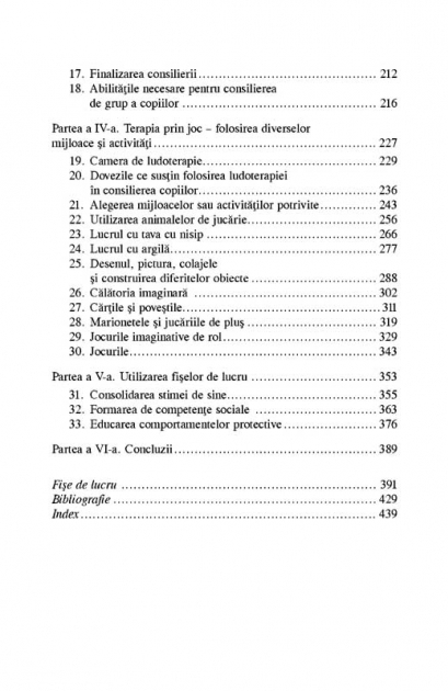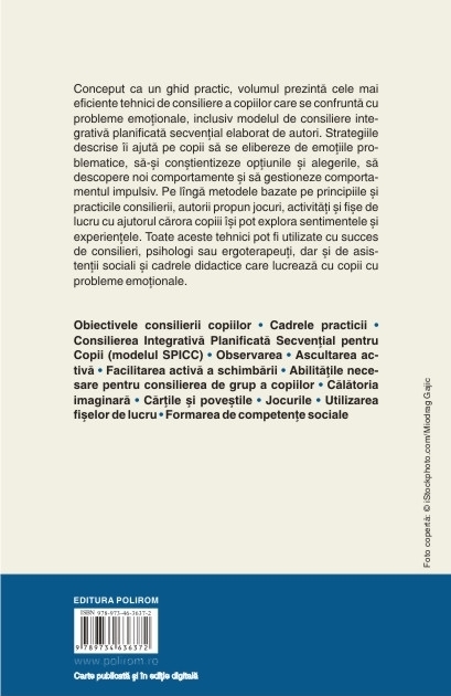 Traducere de Miruna Andriescu Conceput ca un ghid practic, volumul prezinta cele mai eficiente tehnici de consiliere a copiilor care se confrunta cu probleme emotionale, inclusiv modelul de consiliere integrativa planificata secvential elaborat de autori. Strategiile descrise ii ajuta pe copii sa se elibereze de emotiile problematice, sa-si constientizeze optiunile si alegerile, sa descopere noi comportamente si sa gestioneze comportamentul impulsiv. Pe linga metodele bazate pe principiile si practicile consilierii, autorii propun jocuri, activitati si fise de lucru cu ajutorul carora copiii isi pot explora sentimentele si experientele. Toate aceste tehnici pot fi utilizate cu succes de consilieri, psihologi sau ergoterapeuti, dar si de asistentii sociali si cadrele didactice care lucreaza cu copii cu probleme emotionale. Din cuprins: Obiectivele consilierii copiilor • Cadrele practicii • Consilierea Integrativa Planificata Secvential pentru Copii (modelul SPICC) • Observarea • Ascultarea activa • Facilitarea activa a schimbarii • Abilitatile necesare pentru consilierea de grup a copiilor • Calatoria imaginara • Cartile si povestile • Jocurile • Utilizarea fiselor de lucru • Formarea de competente sociale