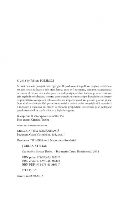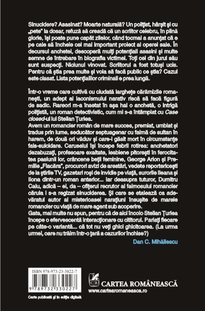 Sinucidere? Asasinat? Moarte naturala? Un politist, hirsit si cu „pete” la dosar, refuza sa creada ca un scriitor celebru, in plina glorie, isi poate pune capat zilelor, cind tocmai a anuntat ca e pe cale sa incheie cel mai important proiect al operei sale. In decursul anchetei, descopera multi potentiali asasini si multe semne de intrebare in biografia victimei. Toti cei din jurul sau sint suspecti. Niciunul vinovat. Scriitorul a fost totusi ucis. Pentru ca stia prea multe si voia sa faca public ce stia? Cazul este clasat. Lista potentialilor criminali e prea lunga. „Intr-o vreme care cultiva cu ciudata larghete caramizile romanesti, un adept al laconismului narativ risca sa faca figura de sadic. Rareori m-a insetat in asa hal o ancheta, o intriga politista, un roman detectivistic, cum mi s-a intimplat cu Case closed-ul lui Stelian Turlea. Avem un romancier roman de mare succes, premiat, umblat si tradus prin lume, seducator septuagenar cu faima de sultan in harem, de doua ori vaduv si care-i gasit mort in circumstante fals-suicidare. Caruselul isi incepe febril rotirea: anchetatori dezabuzati, profesoare exaltate, lesbiene pitoresti in ferocitatea pasiunii lor, crincene betii feminine, George Arion si Premiile „Flacara”, procurori avizi de arestari, vedete reportericesti de la stirile TV, gazetari rosi de invidie pe viata, surorile Ileana si Ilona dintr-un roman anterior... Iar deasupra tuturor, Dumitru Calu, adica – ei, da – ofiterul recrutor al faimosului romancier caruia i s-a regizat sinuciderea. Si care se etaleaza ca adevaratul autor al misterioasei naratiuni insusite de marele romancier cu viata de mare agent sub acoperire. Gata, mai multe nu spun, pentru ca de aici incolo Stelian Turlea incepe o efervescenta interactionare cu cititorul. Pariati fiecare pe cite-o varianta... ca tot nu veti ghici ghicitoarea. (La urma urmei, oare nu traim intr-o tara a cazurilor inchise?)” (Dan C. Mihailescu)