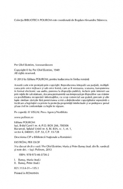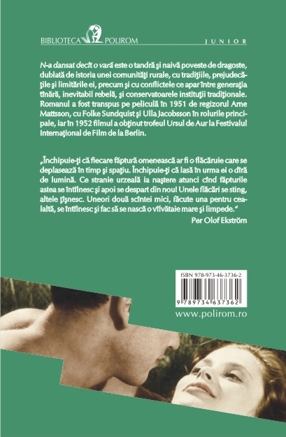 Traducere din limba suedeza si note de Maria si Petre Banus Scris cu sensibilitate si o buna cunoastere a Suediei postbelice, romanul N-a dansat decit o vara este una dintre acele povesti de dragoste care au toate elementele necesare pentru a deveni clasice. Autorul relateaza tumultuoasa istorie a iubirii dintre tinarul Goran, proaspat absolvent de liceu, venit la tara in timpul verii, si Kerstin, o fetiscana care creste la ferma parintilor ei. Pe parcursul naratiunii, nasterea timida si evolutia rapida a involburatei iubiri adolescentine dintre cei doi sunt urmarite cu subtilitate de autor. Pe fundalul optimist al acestei iubiri se desfasoara surd un conflict cu modul de viata al generatiilor trecute, cu o gindire ce-si risipeste energiile in pastrarea cu orice pret a valorilor existente, uitind cu totul de clocotitorii ani ai tineretii. N-a dansat decit o vara este o tandra si naiva poveste de dragoste, dublata de istoria unei comunitati rurale, cu traditiile, prejudecatile si limitarile ei, precum si cu conflictele ce apar intre generatia tinara, inevitabil rebela, si conservatoarele institutii traditionale. Romanul a fost transpus pe pelicula in 1951 de regizorul Arne Mattsson, cu Folke Sundquist si Ulla Jacobsson in rolurile principale, iar in 1952 filmul a obtinut trofeul Ursul de Aur la Festivalul International de Film de la Berlin. „Inchipuie-ti ca fiecare faptura omeneasca ar fi o flacaruie care se deplaseaza in timp si spatiu. Inchipuie-ti ca lasa in urma ei o dira de lumina. Ce stranie urzeala ia nastere atunci cind fapturile astea se intilnesc si apoi se despart din nou! Unele flacari se sting, altele tisnesc. Uneori doua scintei mici, facute una pentru cea-lalta, se intilnesc si fac sa se nasca o vilvataie mare si limpede.” (Per Olof Ekstrom) Carte recomandata de